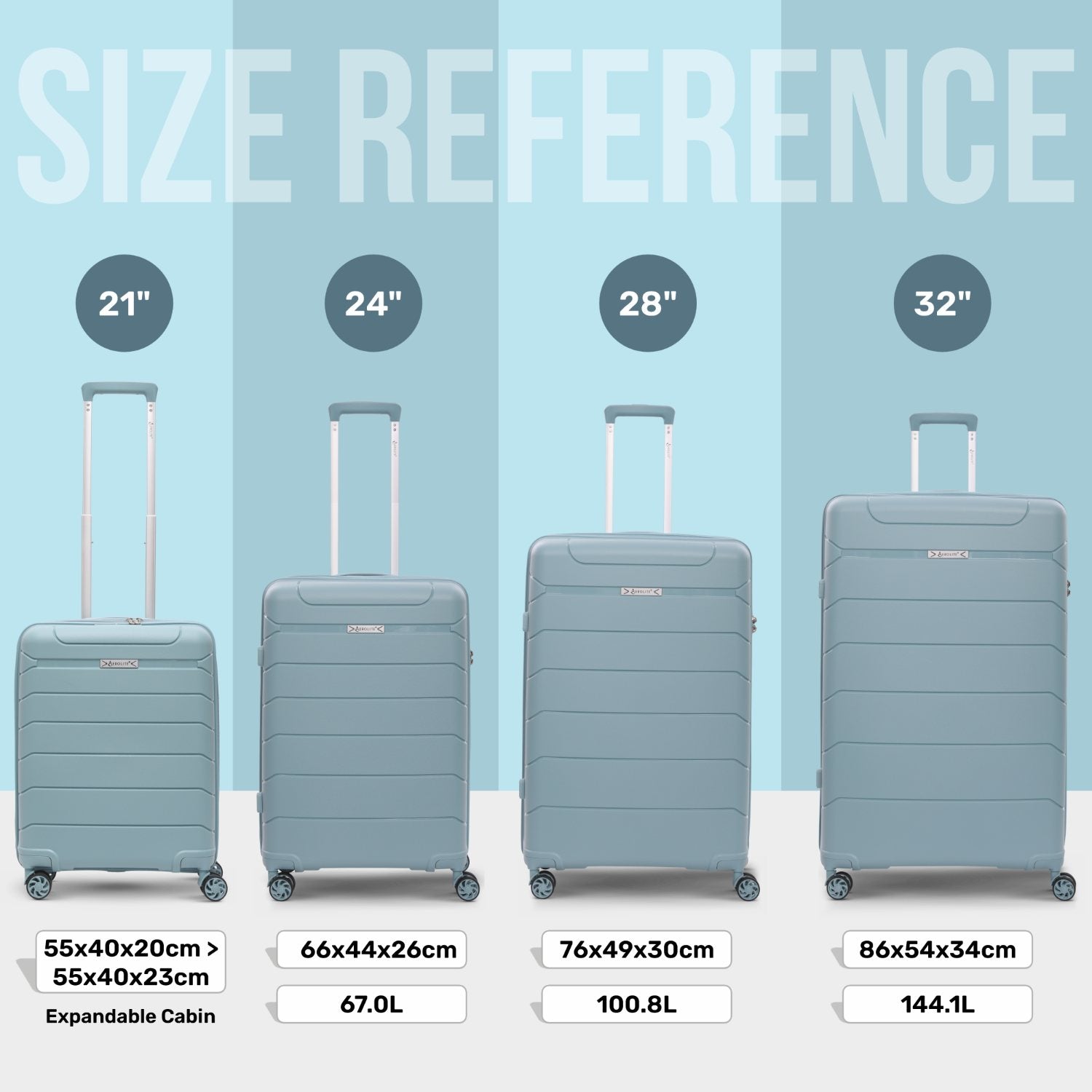 Aerolite Premium PP 4 Piece Hard Shell 4 Dual Wheel Spinner Travel Luggage Suitcase Set , Expandable Cabin + Medium + Large + Extra Large - Sage