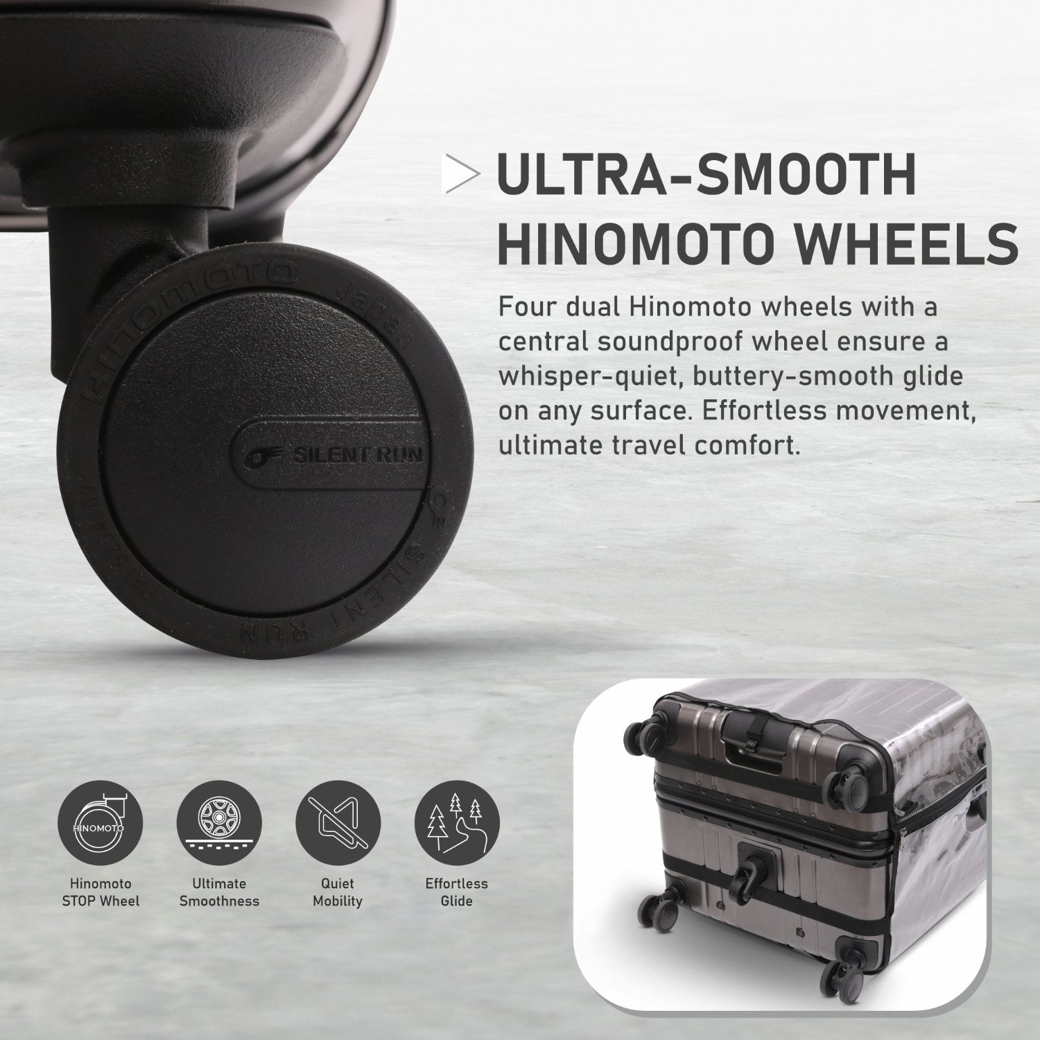 • Hinomoto Ultra-Smooth Wheels - Glide effortlessly with four dual Hinomoto silent spinner wheels and an innovative soundproof middle wheel for noise-free movement.