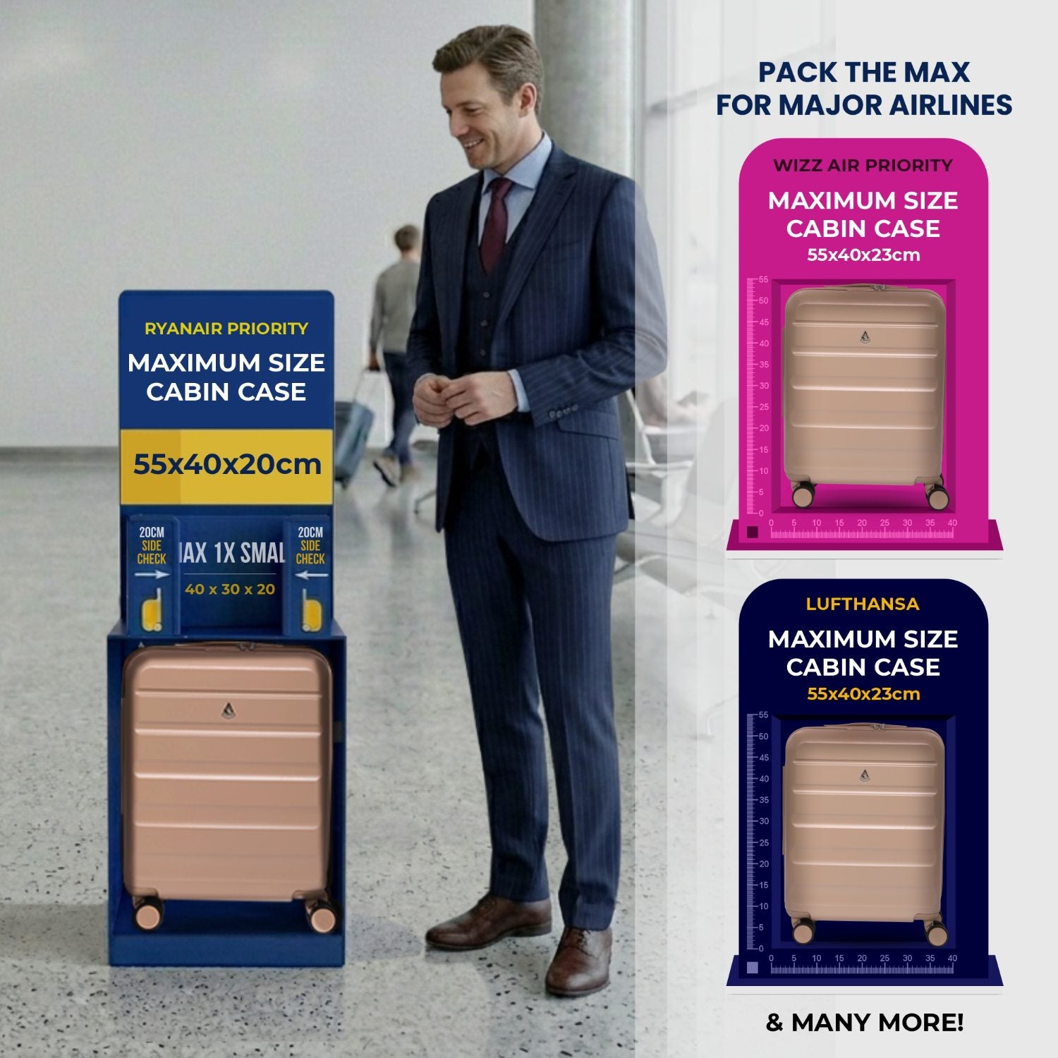 - Unexpanded (55x40x20cm): Maximum Cabin Size for Ryanair Priority, TUI, and Vueling.