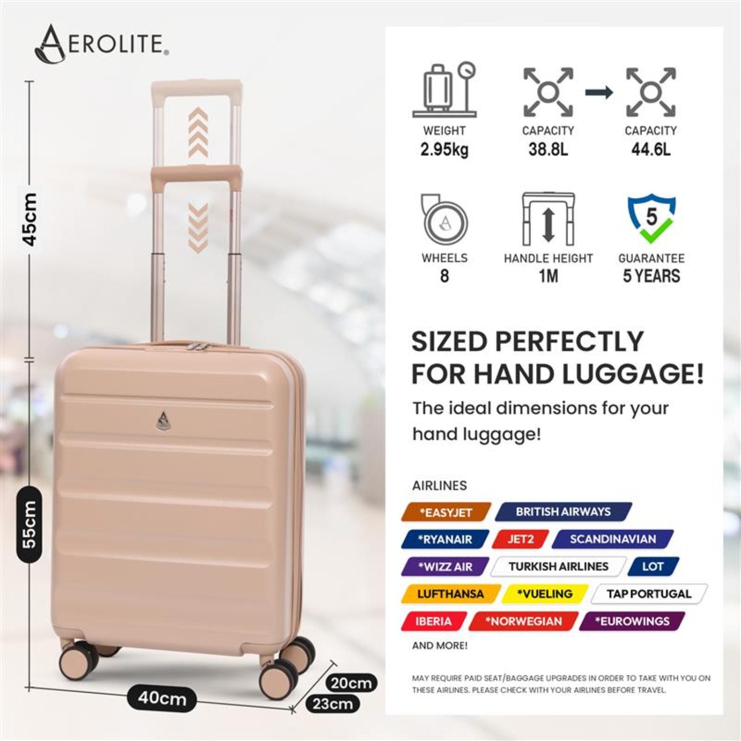 - Expanded (55x40x23cm): Meets maximum cabin size for Lufthansa, Wizz Air Priority, Eurowings, Turkish Airlines, and more.