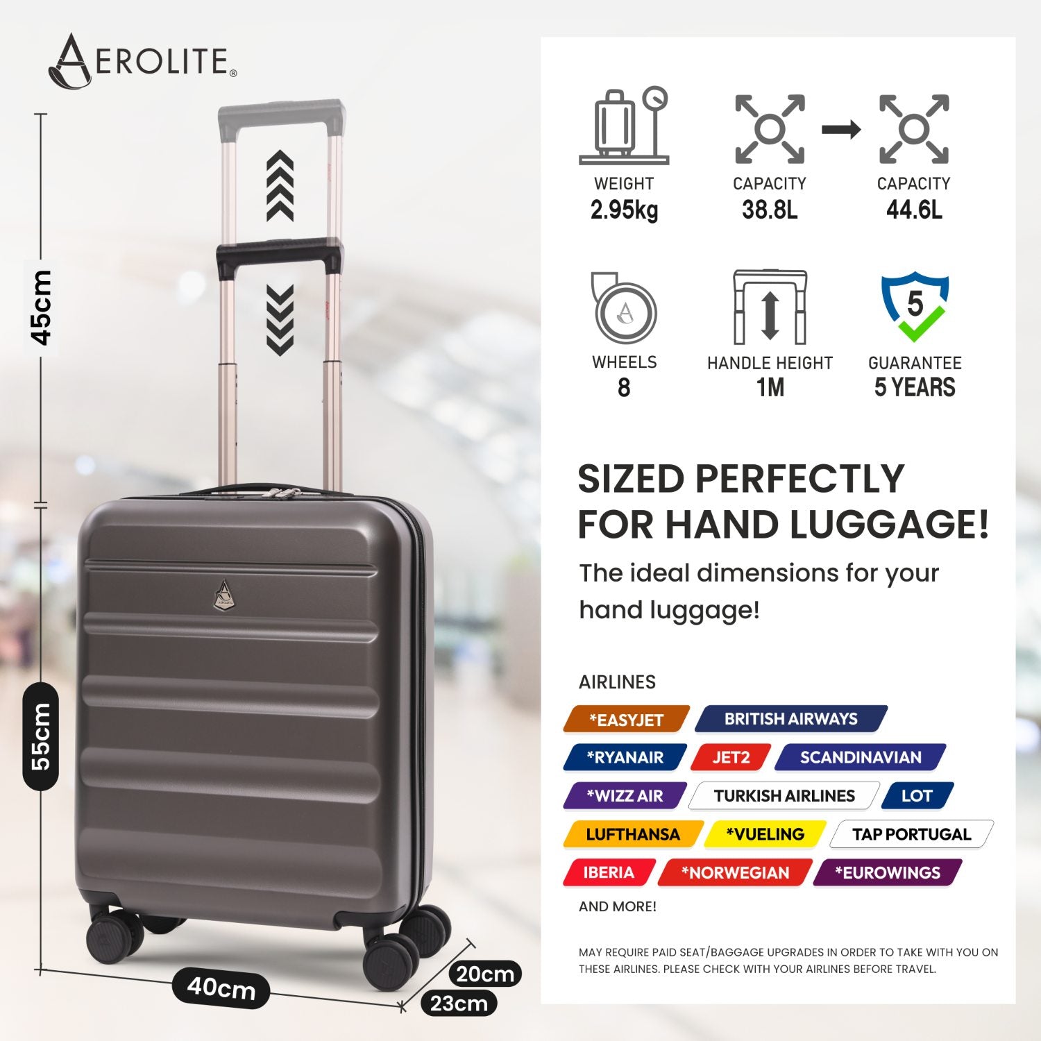 • Expanded (55x40x23cm): Meets maximum cabin size for Lufthansa, Wizz Air Priority, Eurowings, Turkish Airlines, and more.