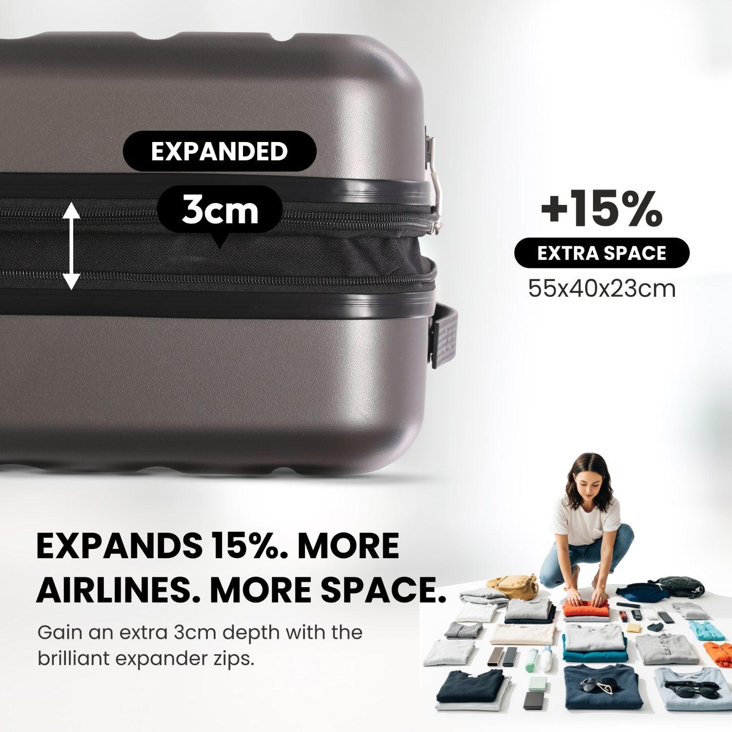 • Expandable Design: Zip-to-expand feature allows you to increase depth by 3cm, giving you 6L more packing space while remaining within airline limits.