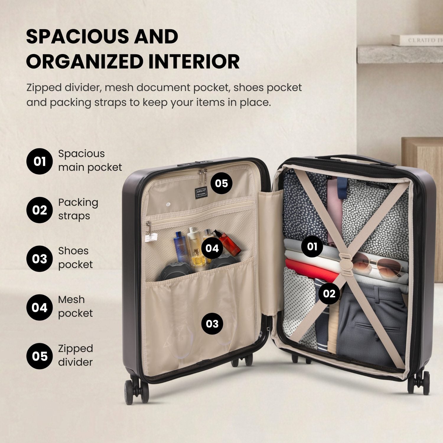 • Organised Interior Layout: Includes packing straps, zipped divider, two shoe pockets, and mesh document pocket for efficient packing.