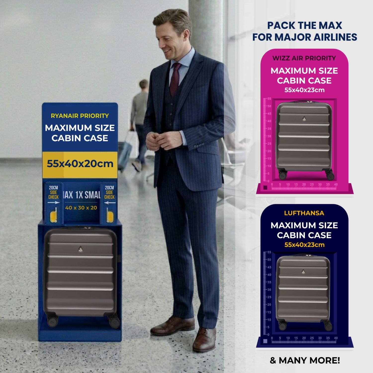 • Unexpanded (55x40x20cm): Maximum Cabin Size for Ryanair Priority, TUI, and Vueling.