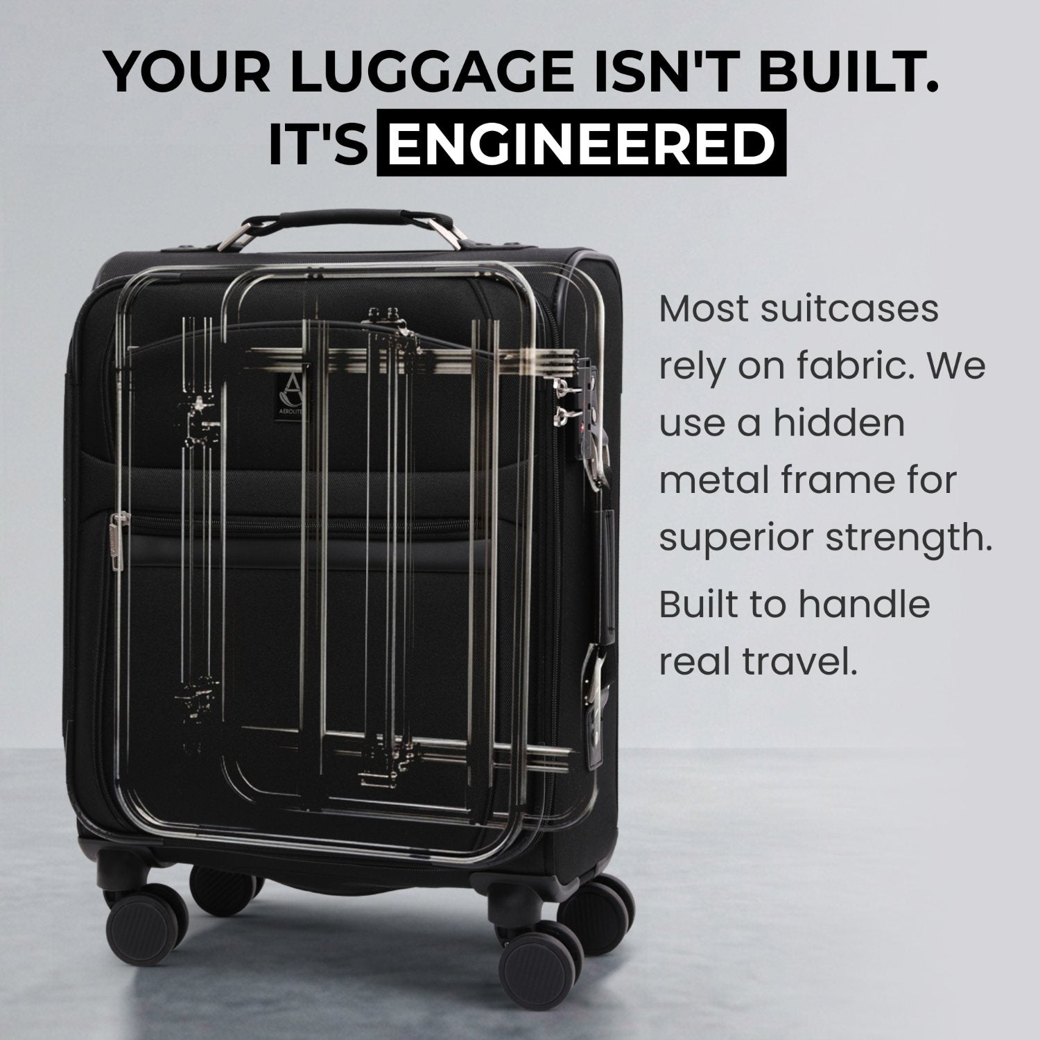 A fully integrated internal metal frame reinforces the entire suitcase, delivering exceptional strength beyond typical soft-shell designs. Finished with high-density performance fabric for a refined look that lasts trip after trip.