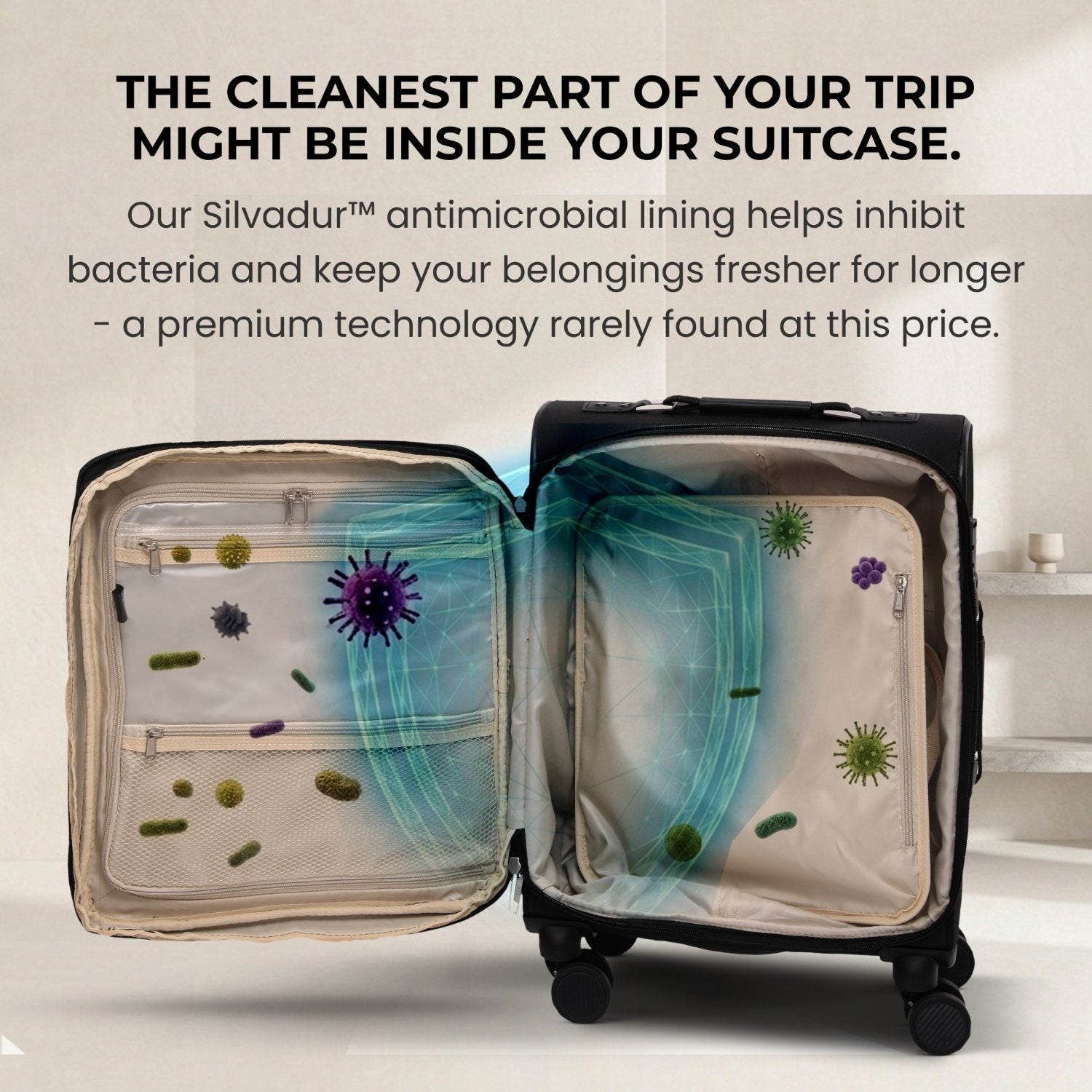 - SILVADUR™ ANTIMICROBIAL LINING & SMART ORGANISATION: Keep your belongings fresher for longer with antimicrobial interior lining. Each suitcase includes multiple zipped compartments, waterproof pockets, and secure packing straps for organised, crease-free packing.